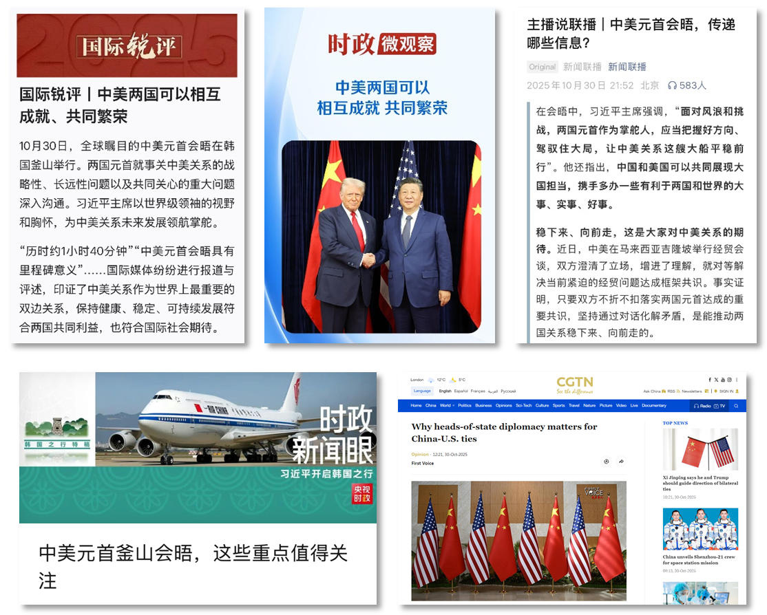 “大國外交最前線”“國際銳評”“時政新聞眼”“時政微觀察”“主播說聯(lián)播”“先聲奪人”“天下觀”等品牌專欄立體聯(lián)動,推出《中美元首會晤開場白,傳遞哪些重磅信息?》《中美元首釜山會晤,這些重點(diǎn)值得關(guān)注》《元首外交掌舵定向》《中美元首會晤 邁向共贏未來》等系列評論,多角度解讀習(xí)近平主席重要講話和兩國元首會晤為動蕩不安的世界注入寶貴的穩(wěn)定性與確定性。