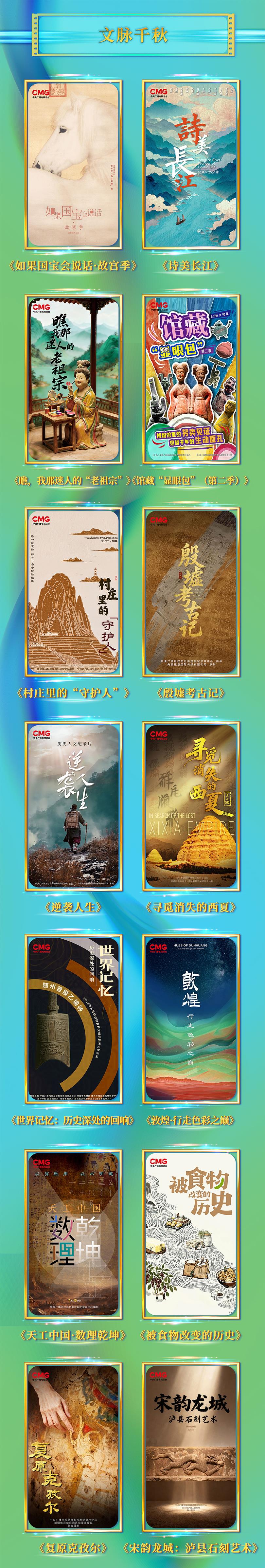 “文脈千秋”板塊發(fā)布14部品質新作,探尋中華文明綿延密碼、記錄東方智慧的使命與擔當。《如果國寶會說話·故宮季》展現故宮珍寶之美,讓厚重歷史再次鮮活;《詩美長江》以經典詩詞解碼長江生態(tài)之美、文明之韻與精神之魂;《瞧,我那迷人的“老祖宗”》在妝容服飾文物中探尋中華美學創(chuàng)造力;《館藏“顯眼包”(第二季)》用年輕化語言創(chuàng)新文物故事的傳播方式。《復原克孜爾》《村莊里的“守護人”》《殷墟考古記》《逆襲人生》《尋覓消失的西夏》《世界記憶:歷史深處的回響》《敦煌·行走色彩之巔》《天工中國·數理乾坤》《被食物改變的歷史》《宋韻龍城:瀘縣石刻藝術》等作品照見文物守護者的質樸堅守,展現數理乾坤中的匠心智慧,追溯一段段絢爛而神秘的歷史傳奇,從多個角度與觀眾一同感知“何以中國”。
